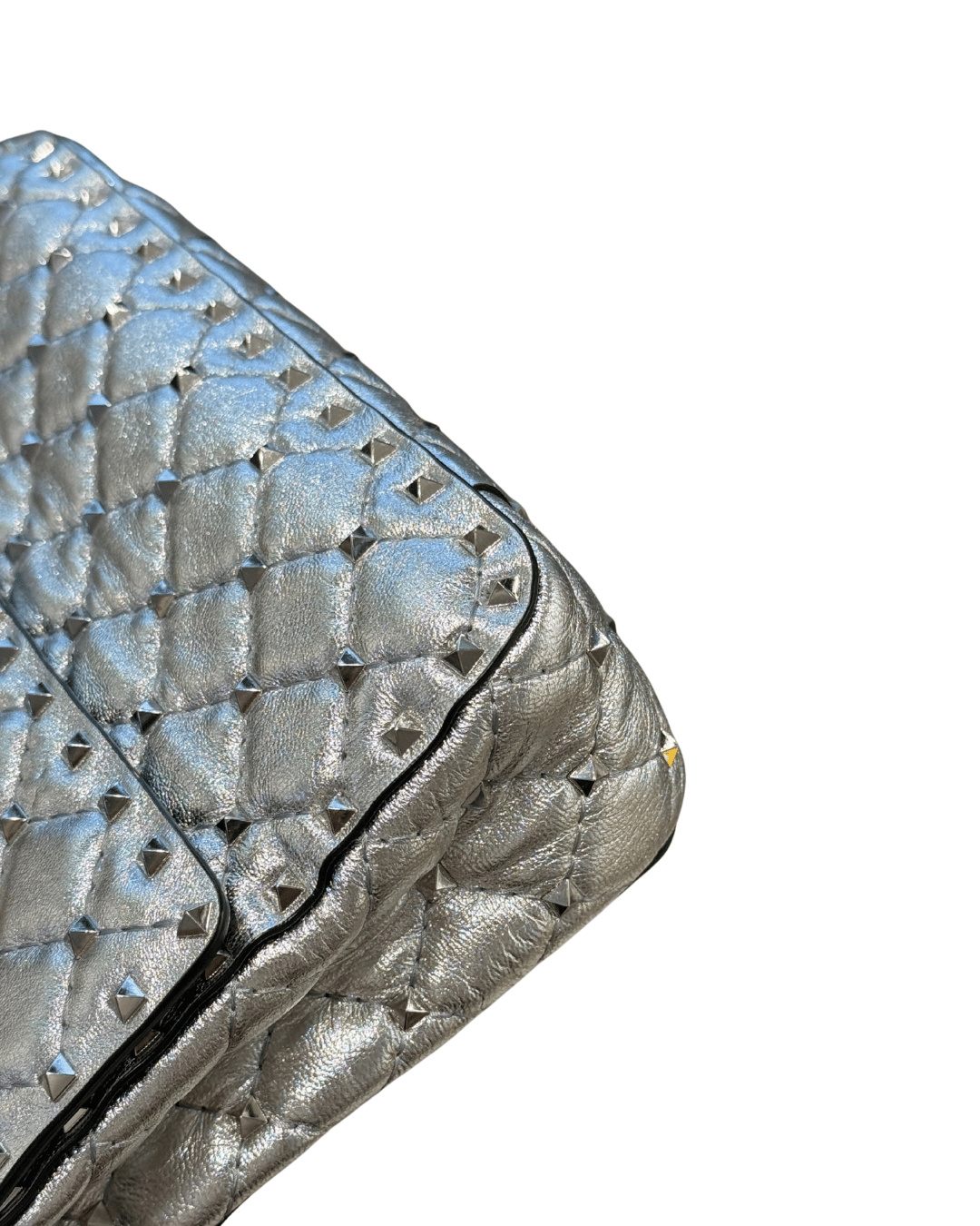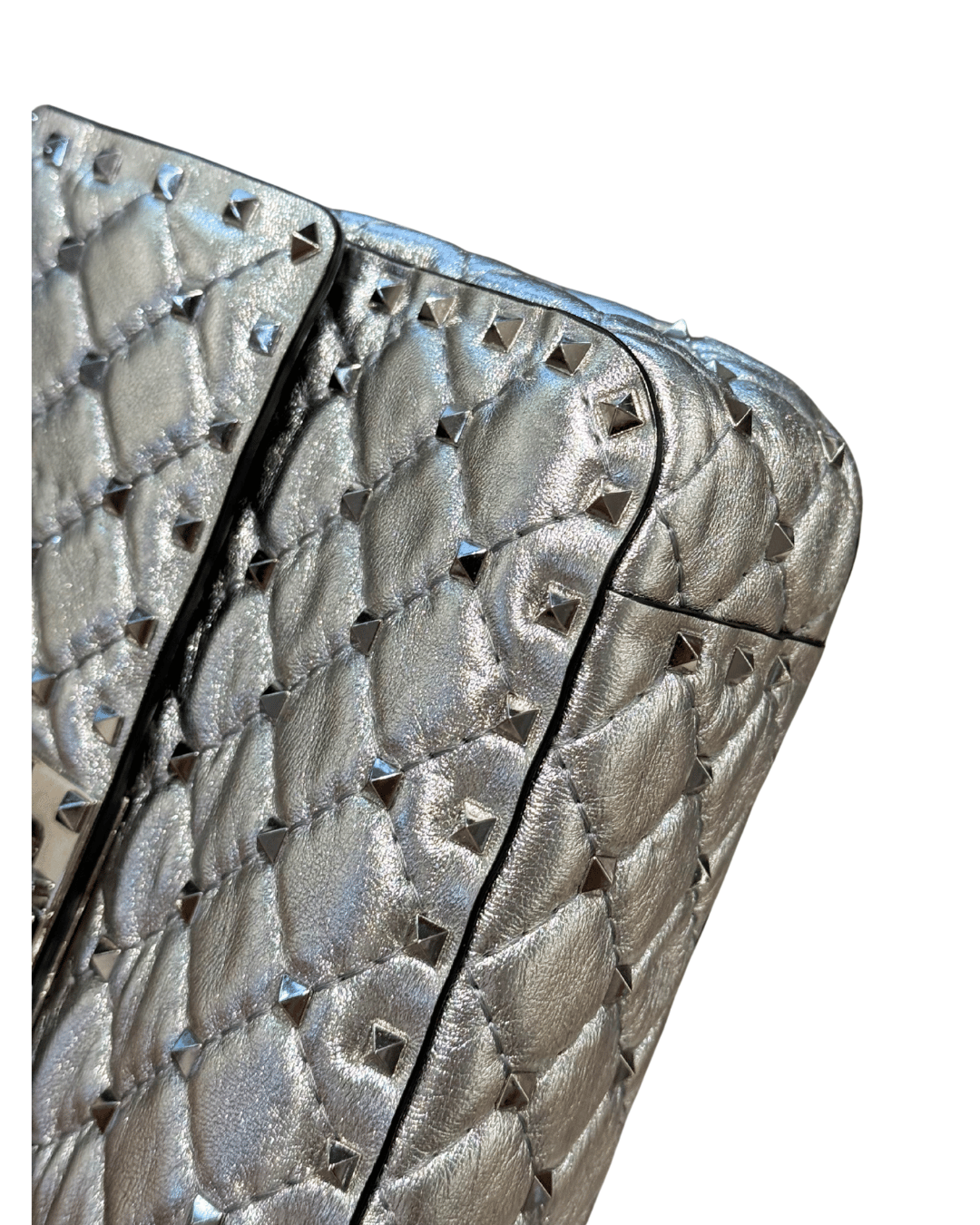 Borsa Valentino in nappa di agnello argentata , super luminosa. Lavorazione trapuntata decorata con piccole borchie . ,Manico superiore e tracolla a catena che permettono di indossare la borsa a spalla, a mano e a tracolla . Pattina con chiusura a girello, interno in pelle , tasca con cerniera.