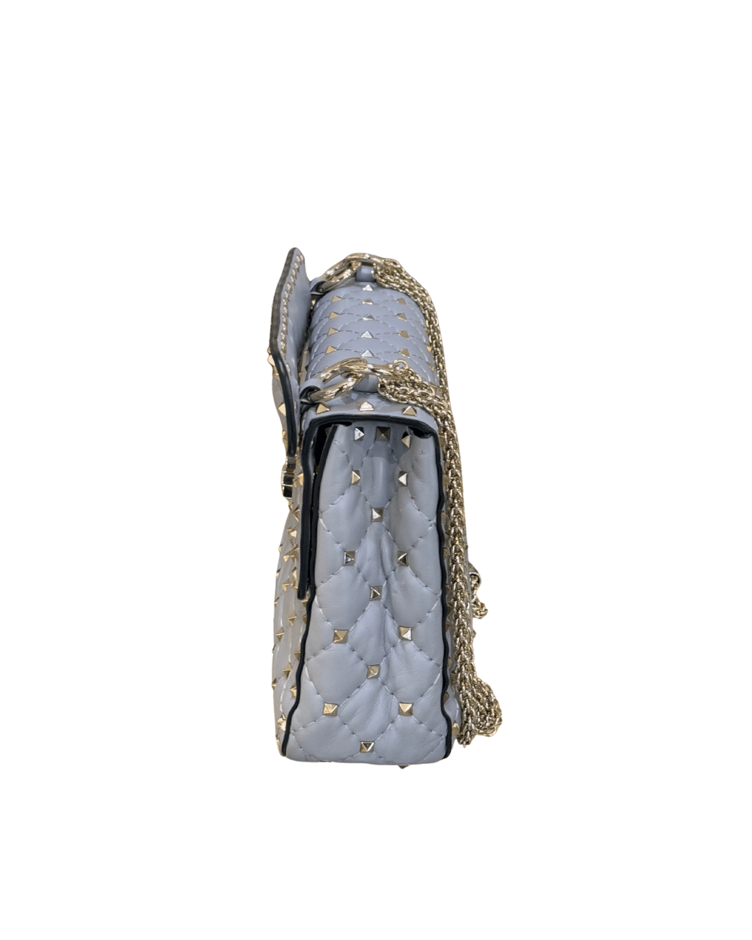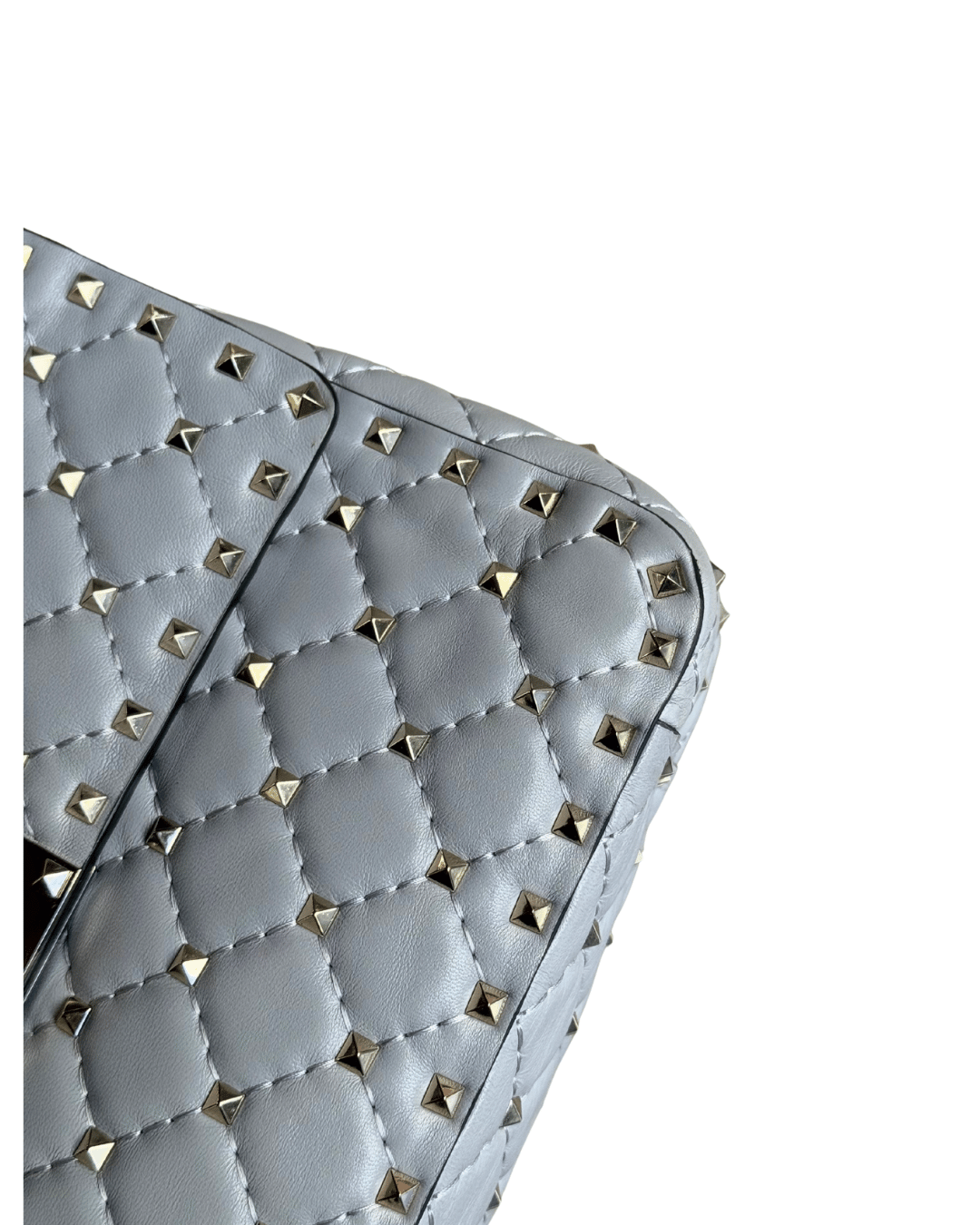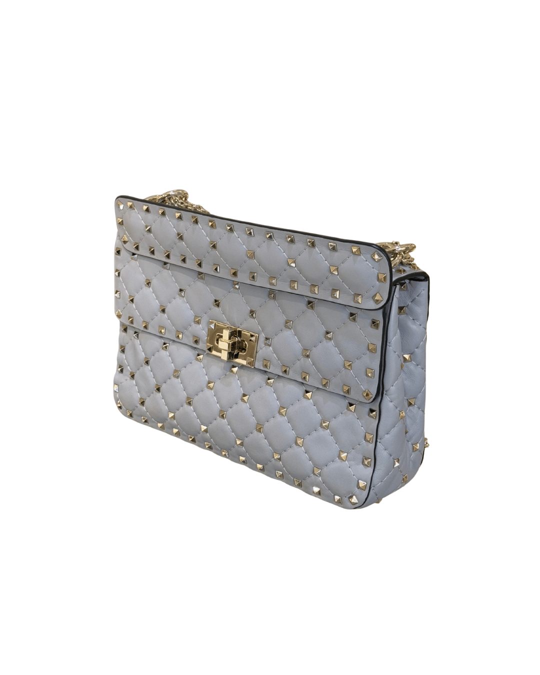 Borsa Valentino in nappa di agnello grigia/azzurra. Lavorazione trapuntata decorata con piccole borchie . ,Manico superiore e catena scorrevole che permettono di indossare la borsa a spalla, a mano e a tracolla . Pattina con chiusura a girello, interno in pelle , tasca con cerniera.