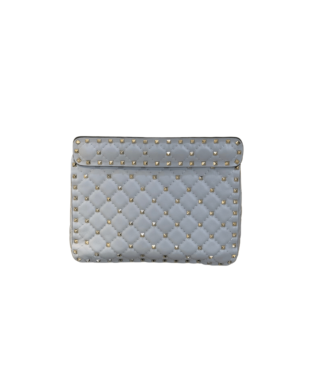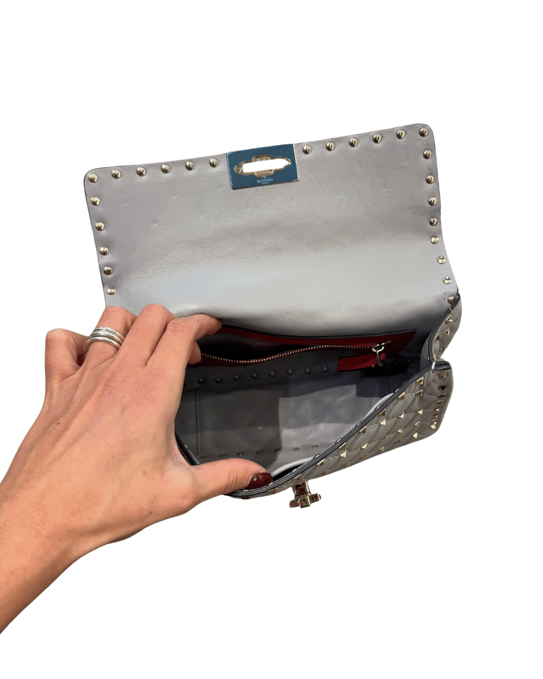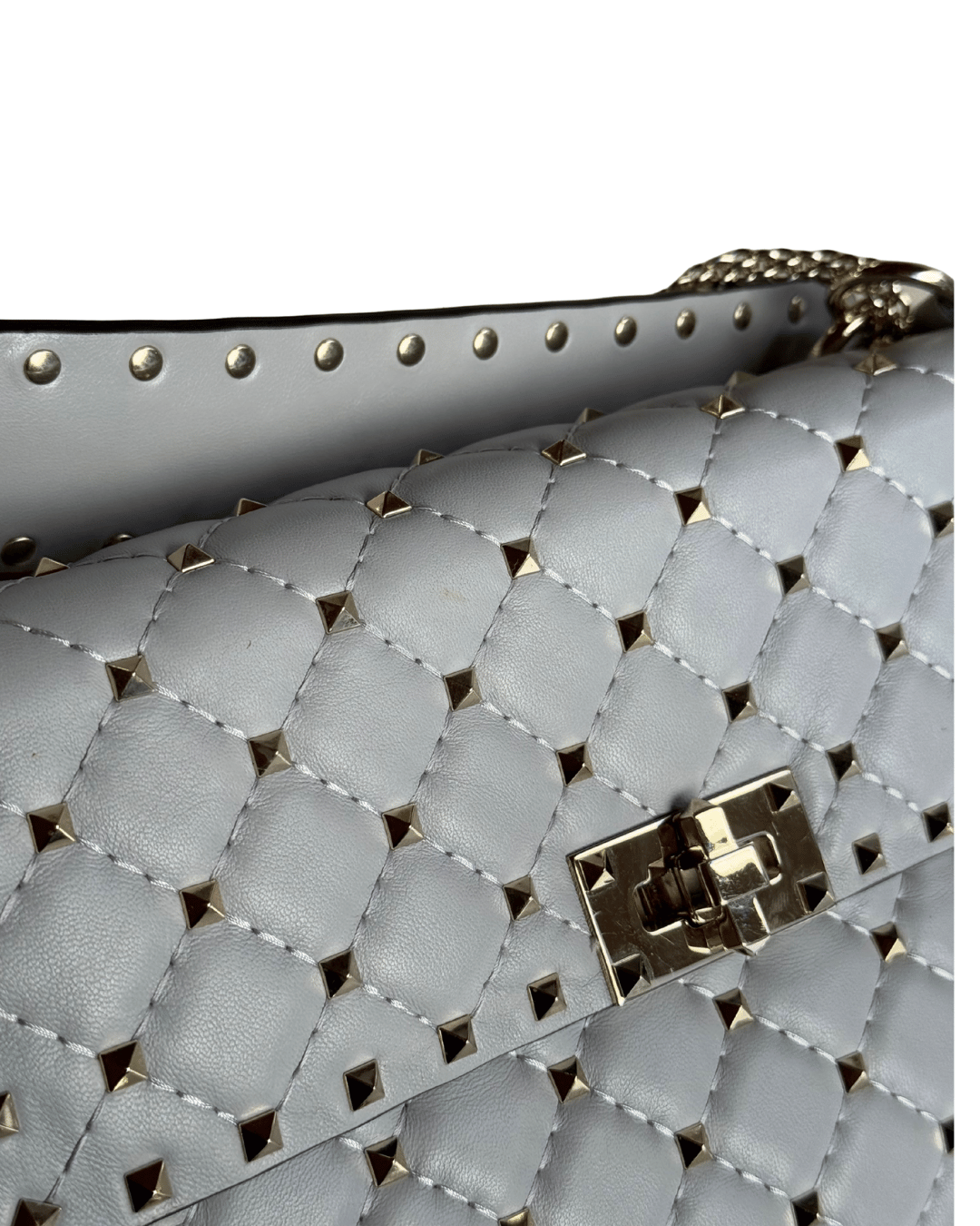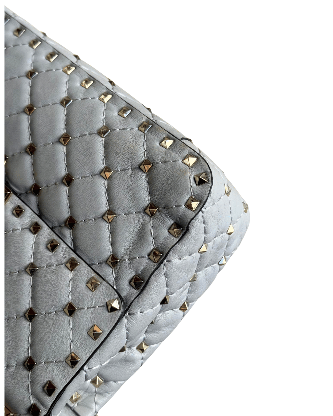 Borsa Valentino in nappa di agnello grigia/azzurra. Lavorazione trapuntata decorata con piccole borchie . ,Manico superiore e catena scorrevole che permettono di indossare la borsa a spalla, a mano e a tracolla . Pattina con chiusura a girello, interno in pelle , tasca con cerniera.
