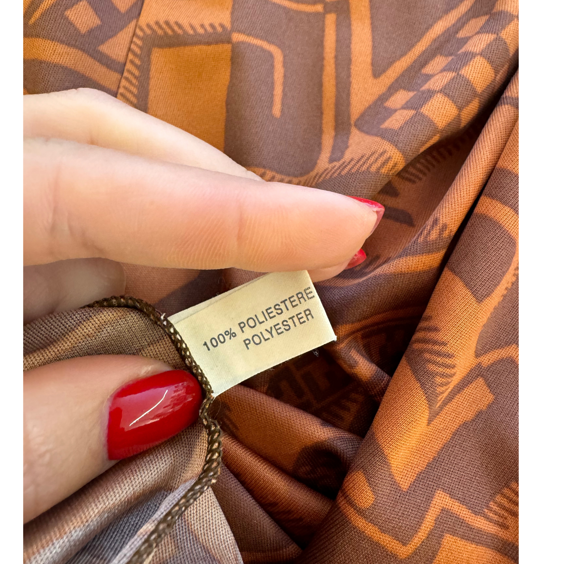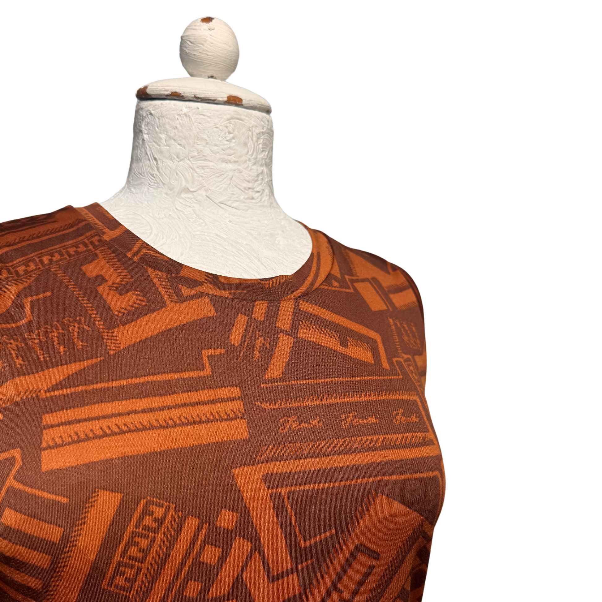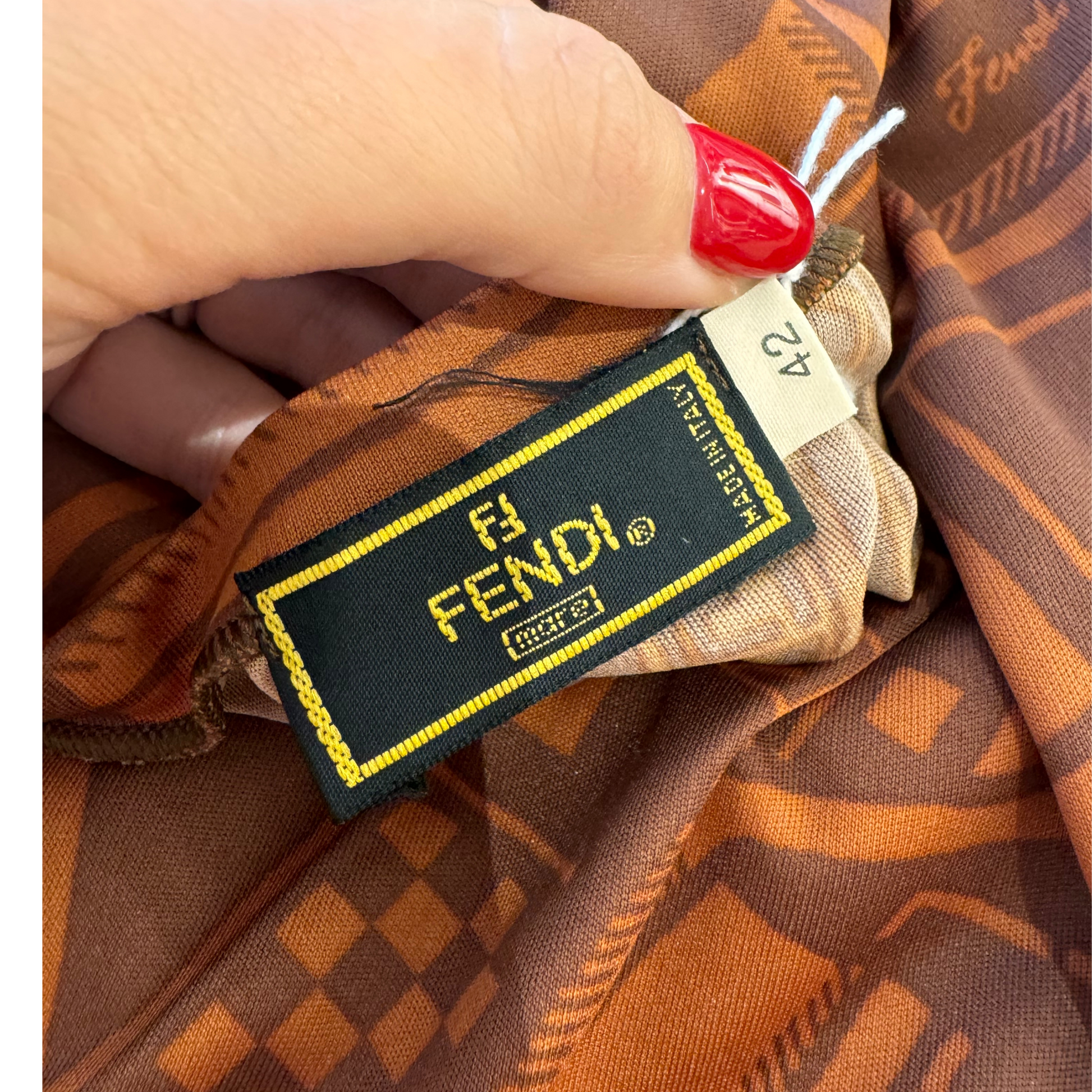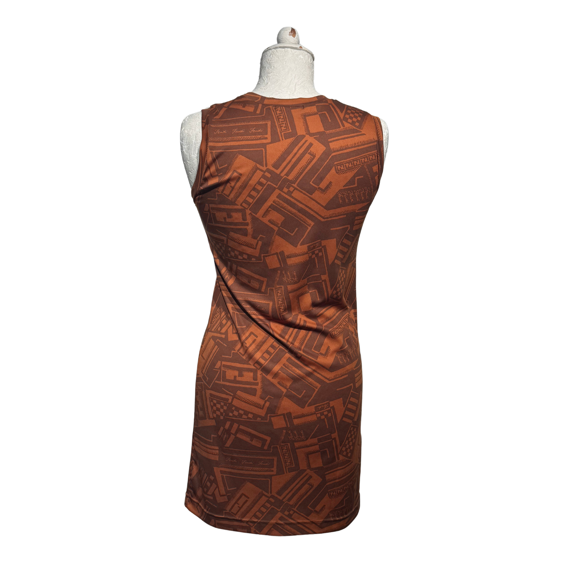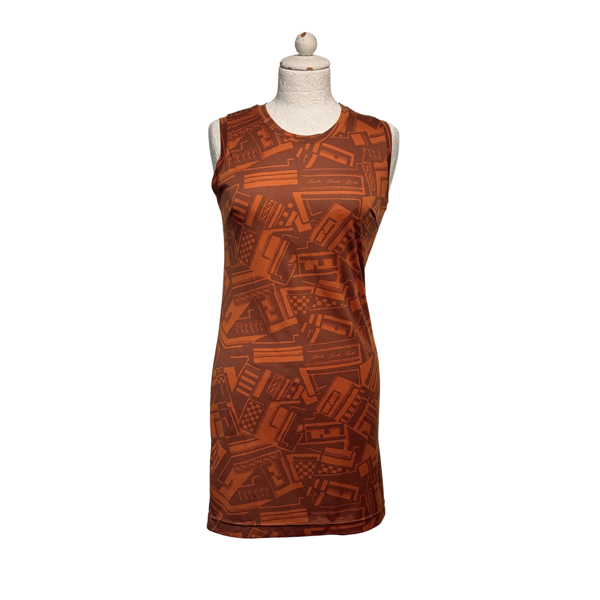 Vestitino Fendi in poliestere color mattone con loghi di una tonalità più scura. Smanicato, elasticizzato.