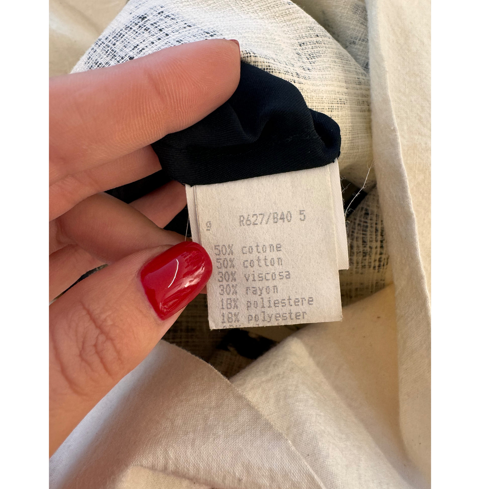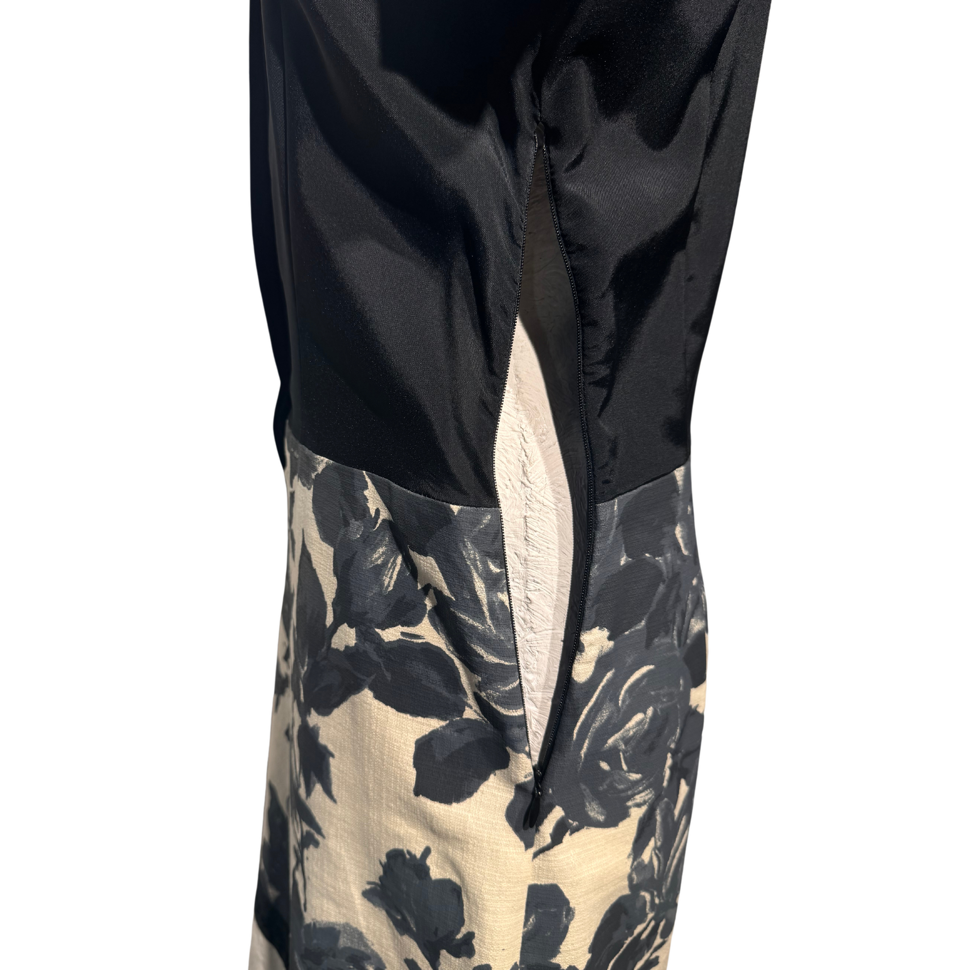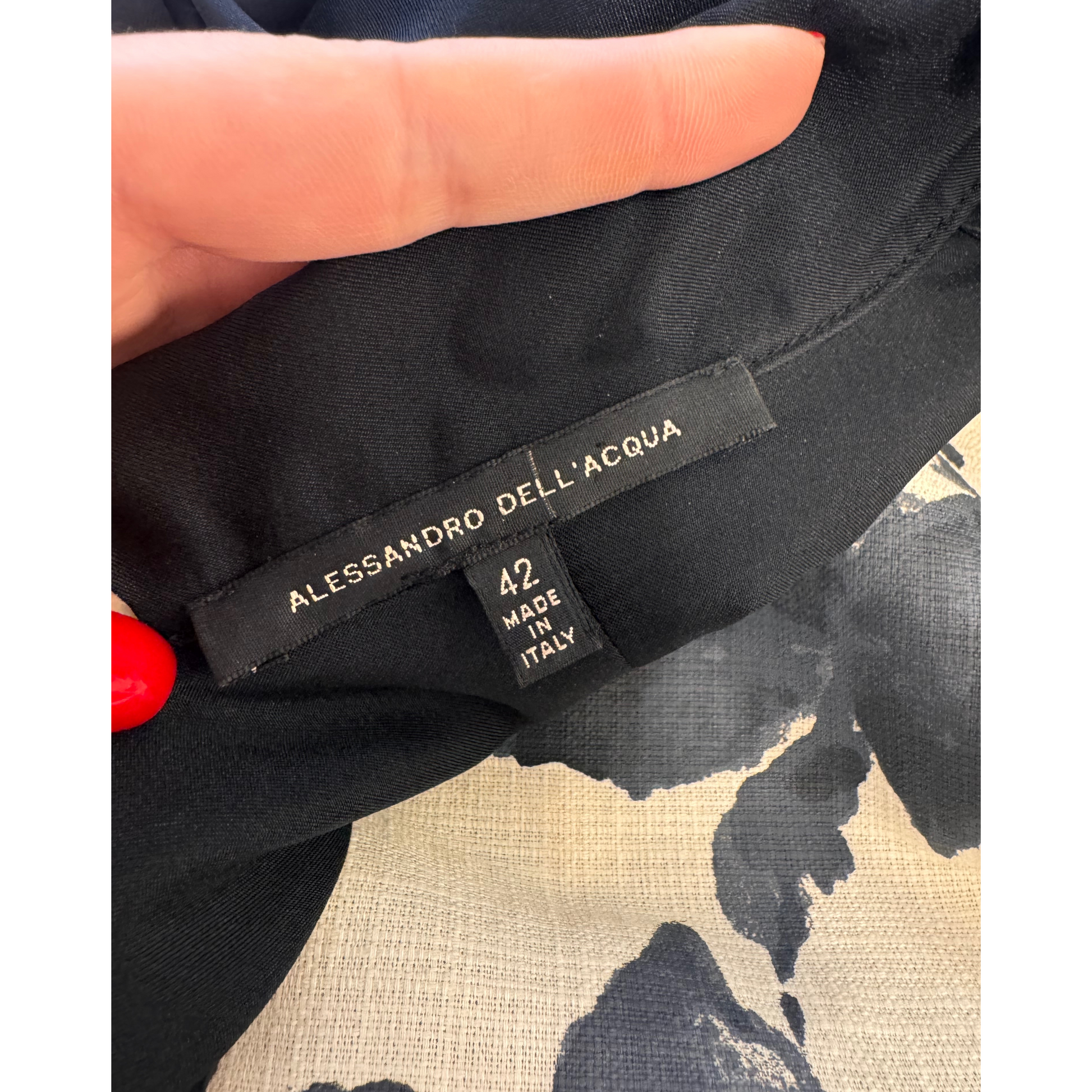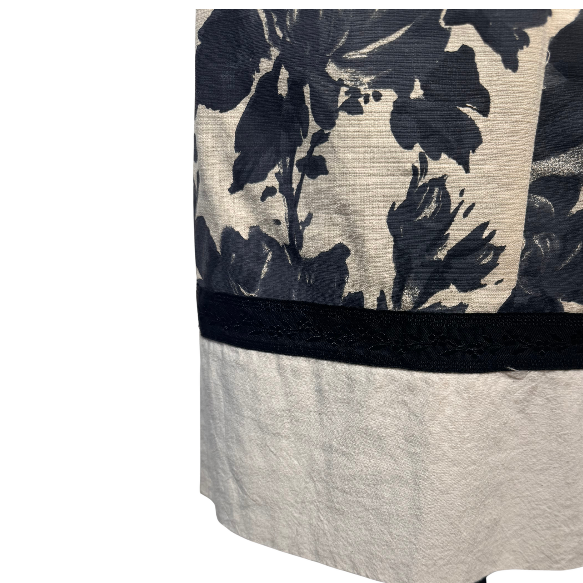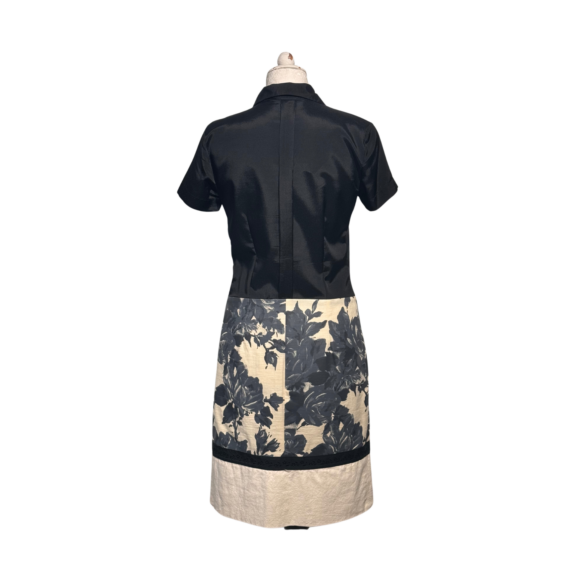 Stupendo vestito Alessandro dall'Acqua, gonna strutturata in cotone color bianco sporco con trama fiori blu e corpetto a camicia blu notte con bottoni e manica corta. Apertura con cerniera laterale.