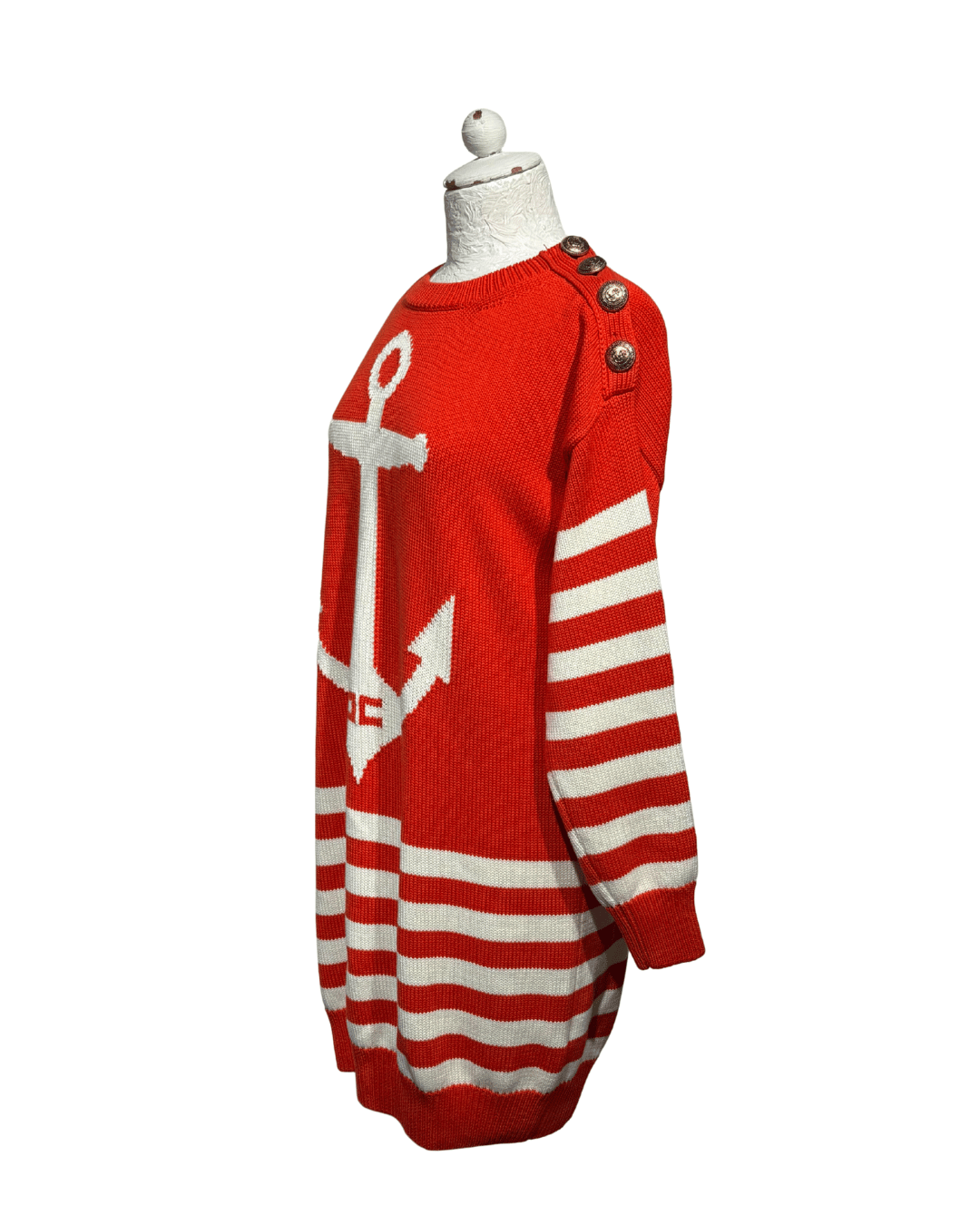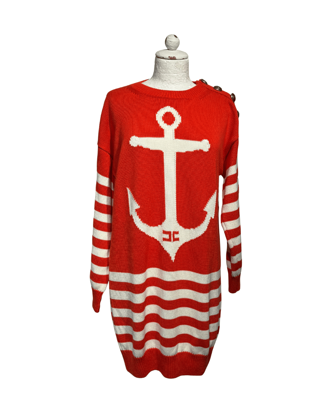 Un capo dal fascino marinaro firmato Elisabetta Franchi, realizzato in 100% cotone Made in Italy. Questo abito in maglia gioca con un vivace contrasto tra il rosso corallo e il bianco, impreziosito dal grande motivo ad ancora sul davanti, simbolo di forza e stile. Il design è reso ancora più caratteristico dalle righe orizzontali che slanciano la silhouette e dai bottoni dorati applicati sulla spalla, un dettaglio iconico che richiama l’eleganza navy. La vestibilità morbida e confortevole lo rende perfetto sia indossato come mini abito, sia come maxi pull con leggings o stivali.