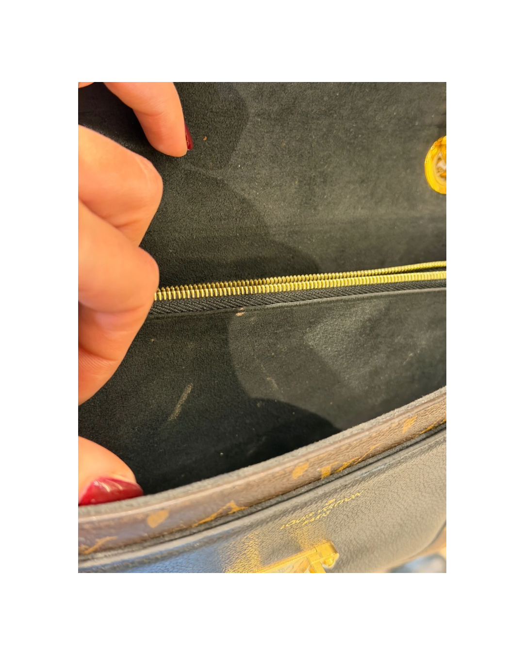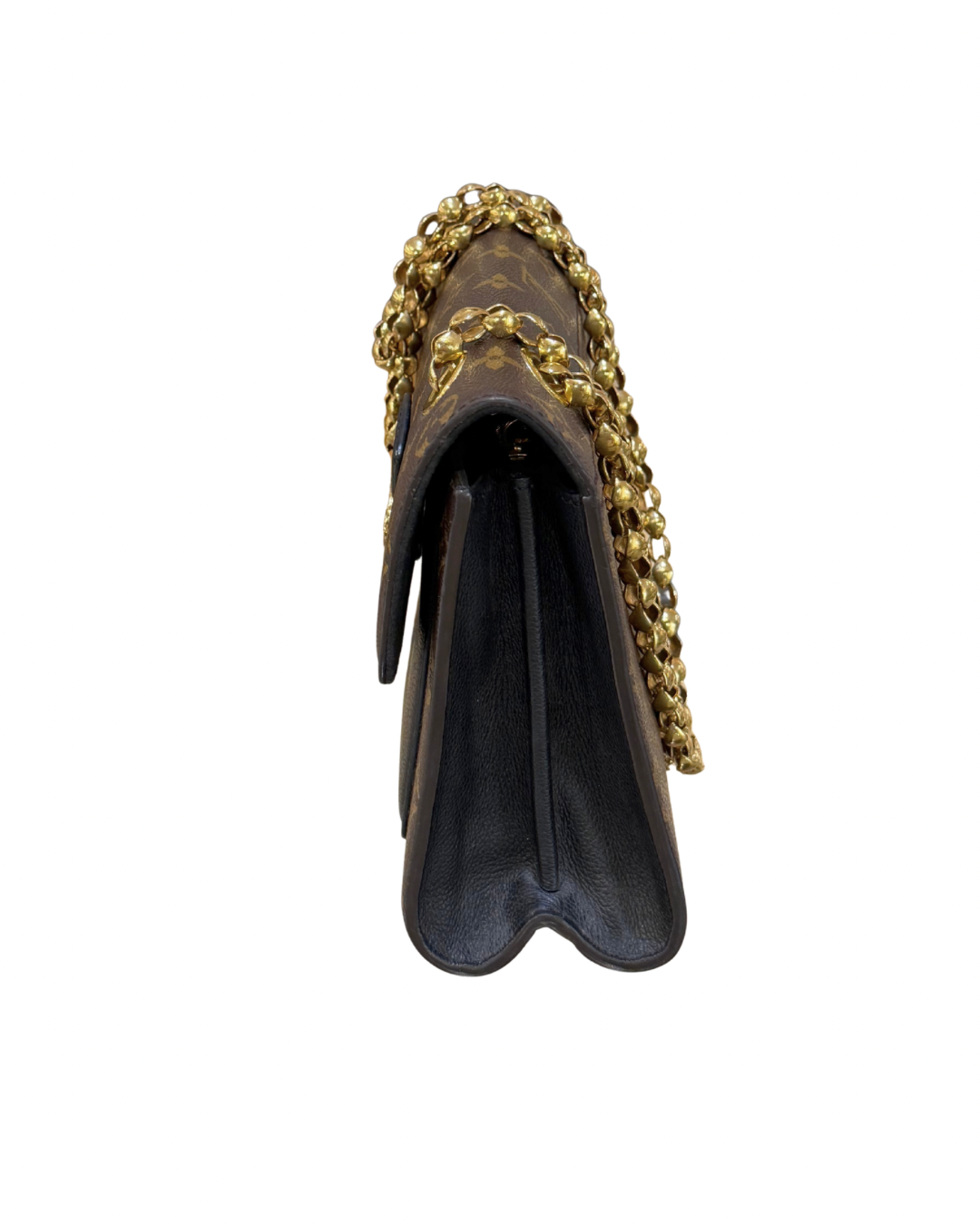 Victorie di Louis Vuitton, unione perfetta tra eleganza parigina e stile contemporaneo. Realizzata in iconica tela monogram con inserti in pelle nera. Tracolla a catena dorata scorrevole che consente di indossarla a spalla e a tracolla. Chiusura a gioiello ispirata ai bauli storici, apertura a pressione. Interno in Alcantara nero suddiviso in due scomparti, tasca centrale con cerniera. (CODICE: AH1199)
