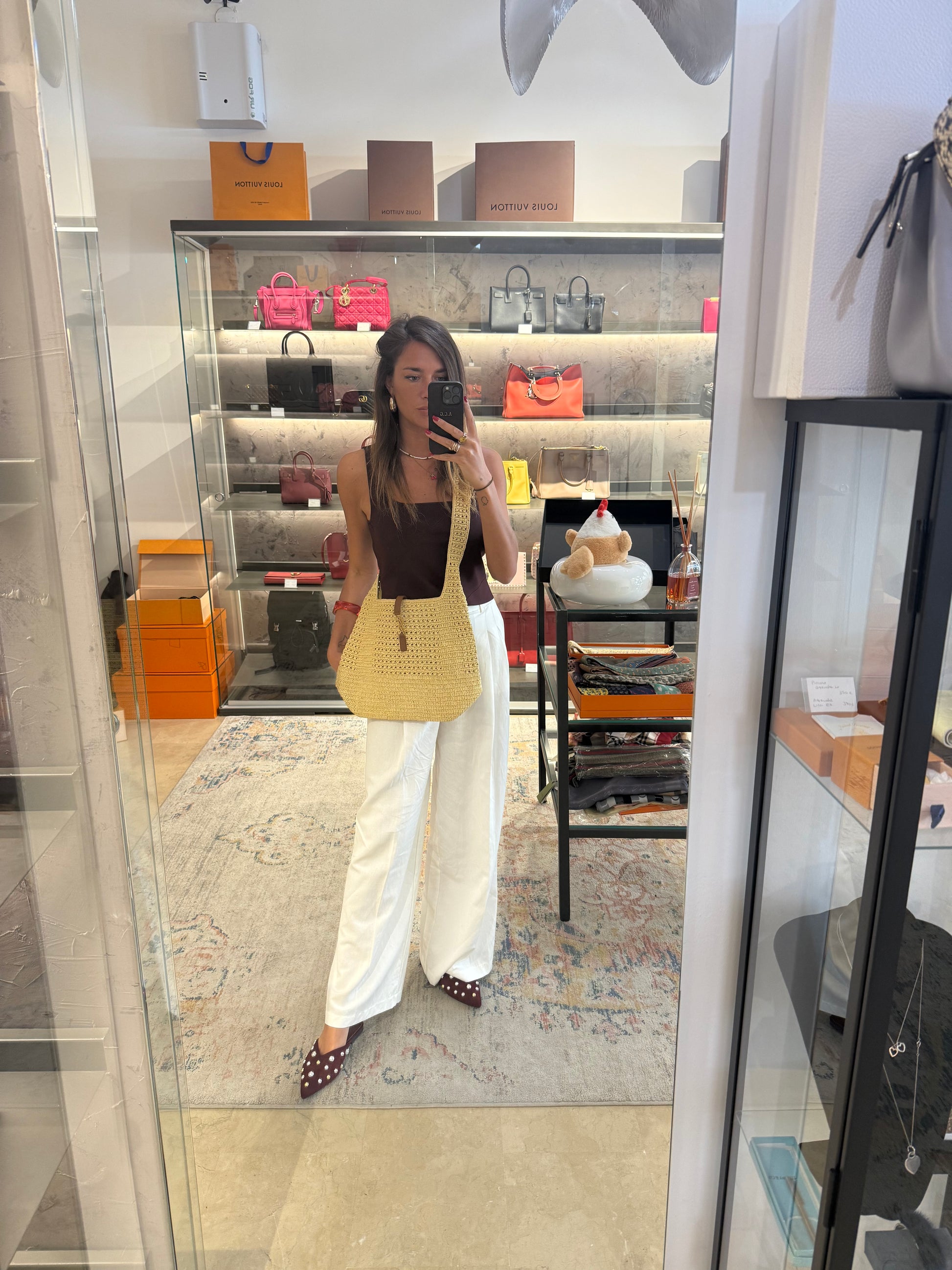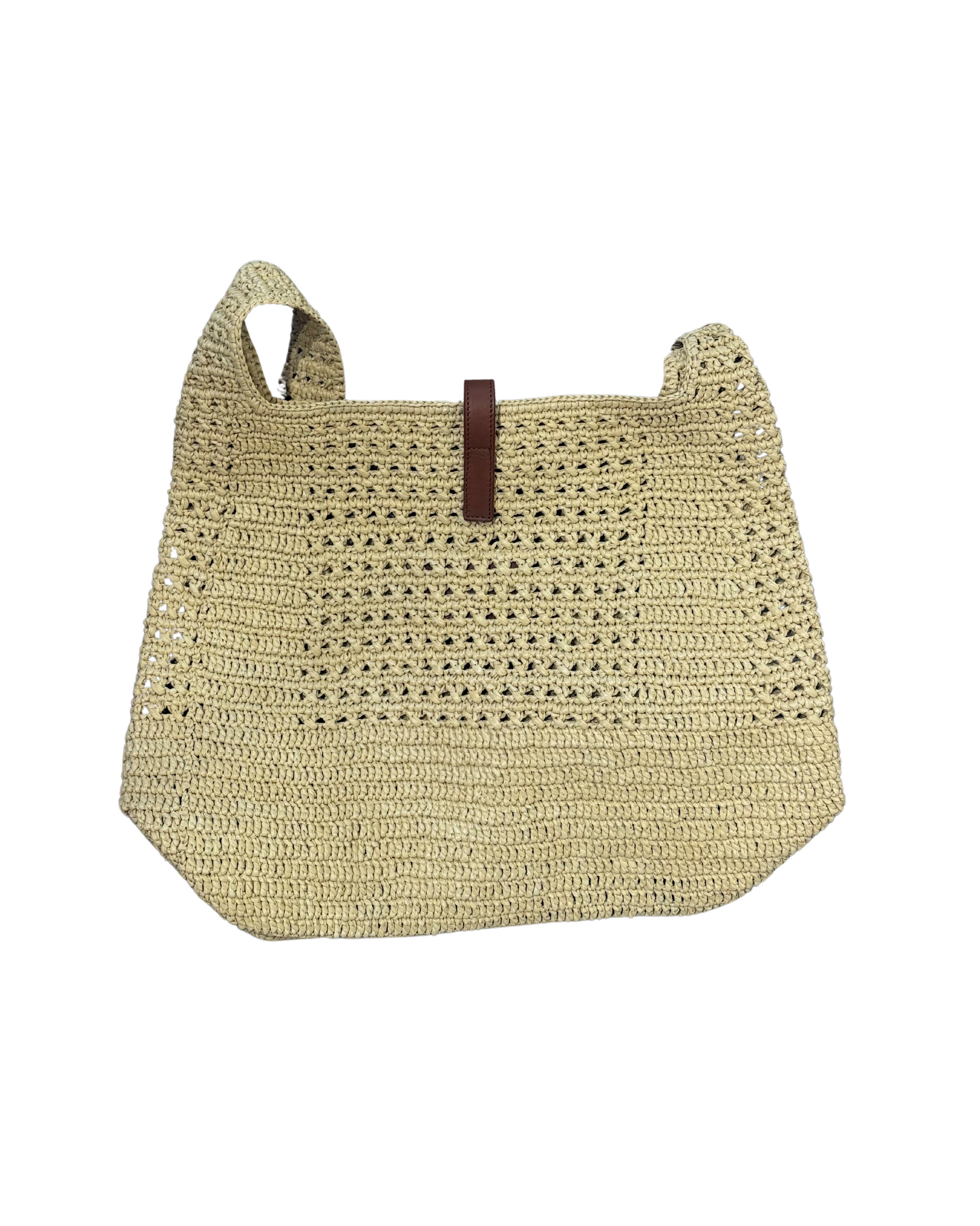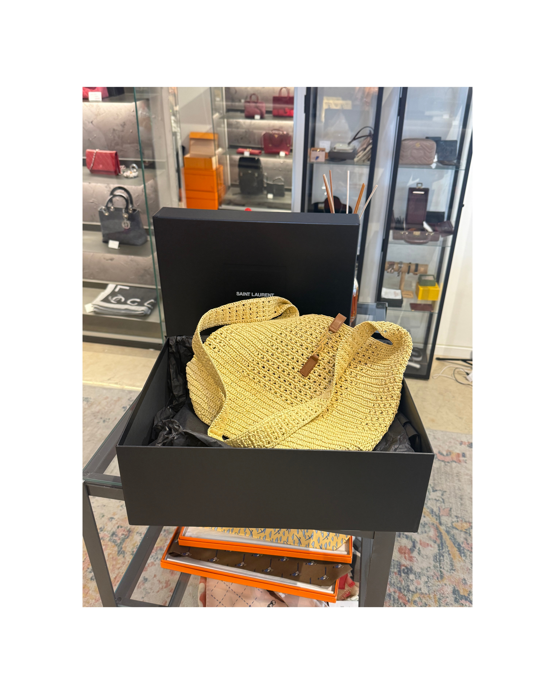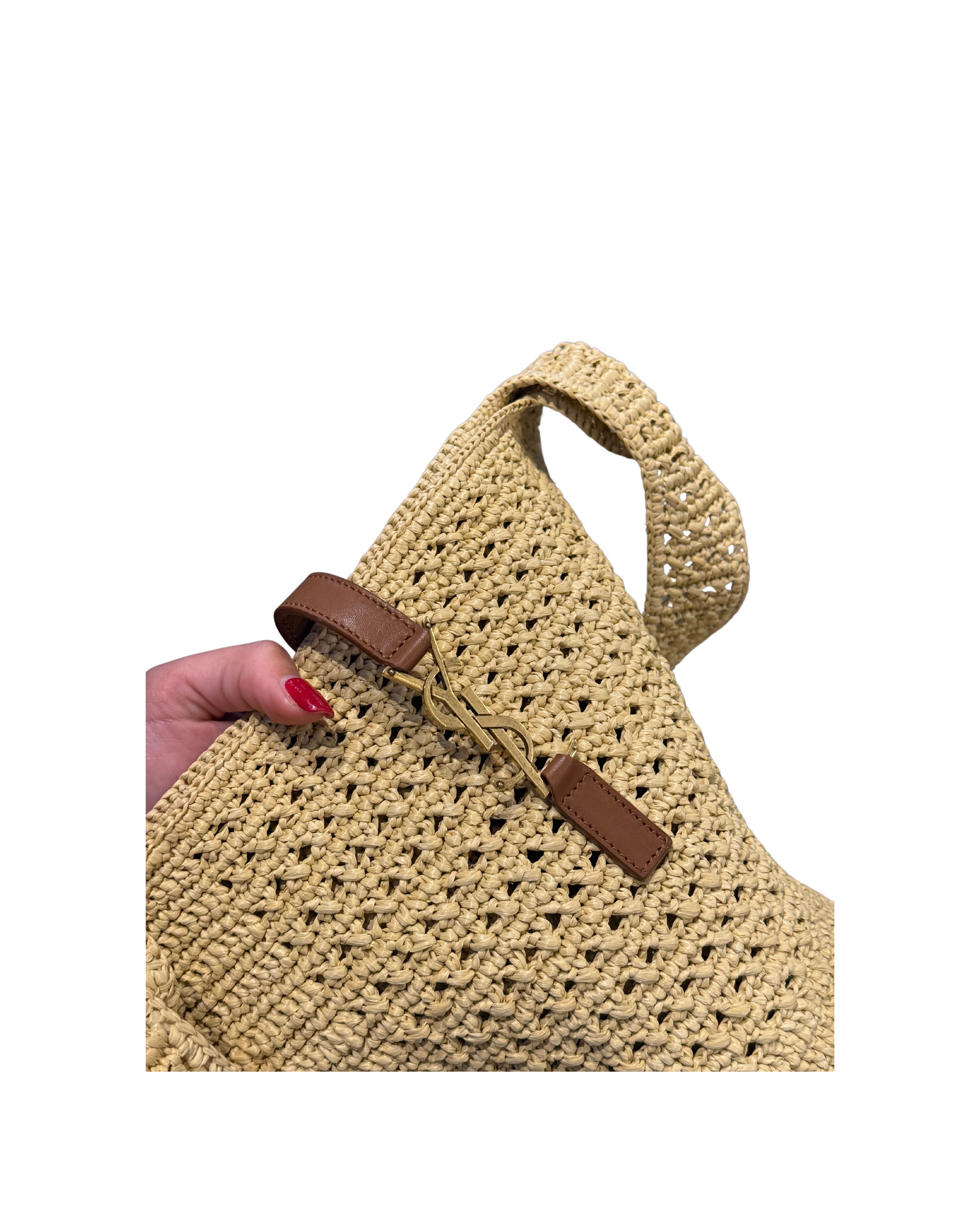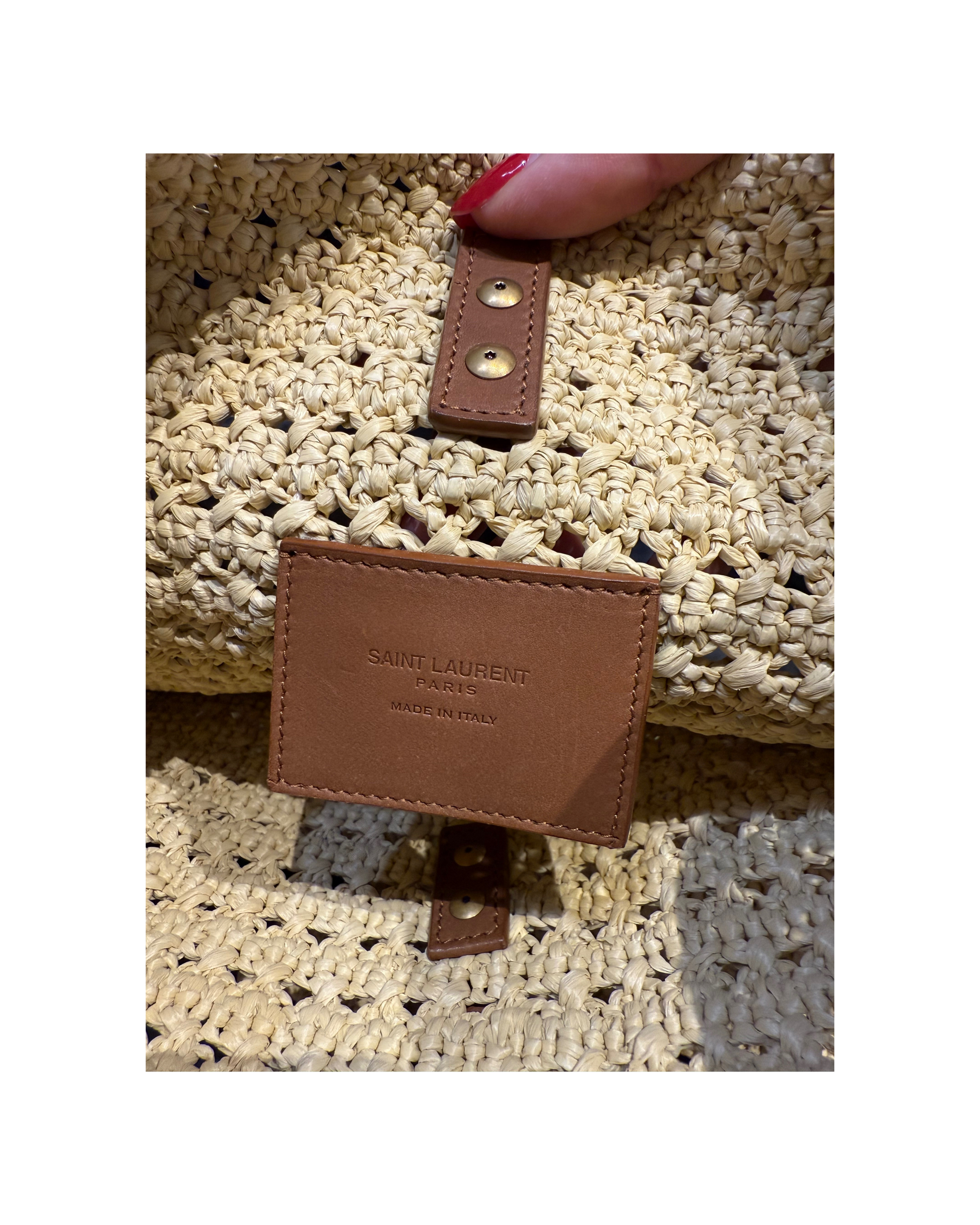 Casual, chic e perfetta per l 'estate: questa borsa Saint Laurent in rafia naturale intrecciata a mano unisce artigianalità e stile parigino. Il design morbido e strutturato al tempo stesso è completato da dettagli in pelle liscia color cuoio e dalla chiusura con gancio dorato e logo YSL iconico. La Tracolla in raffia consente di indossarla sia a spalla che crossbody. ( codice: YSL690941)