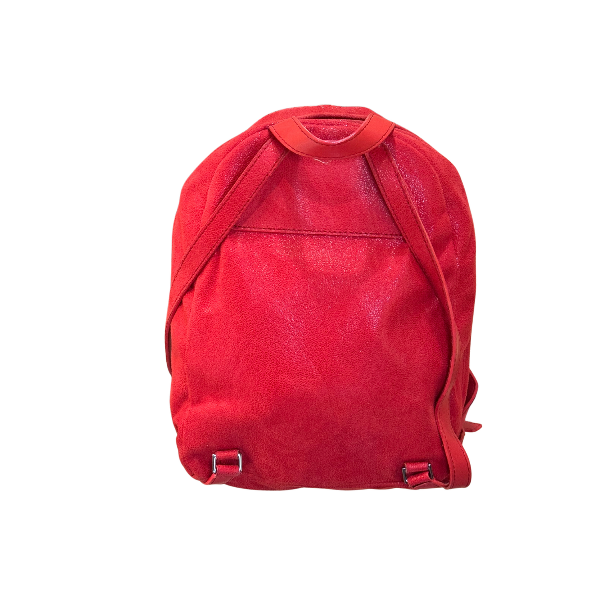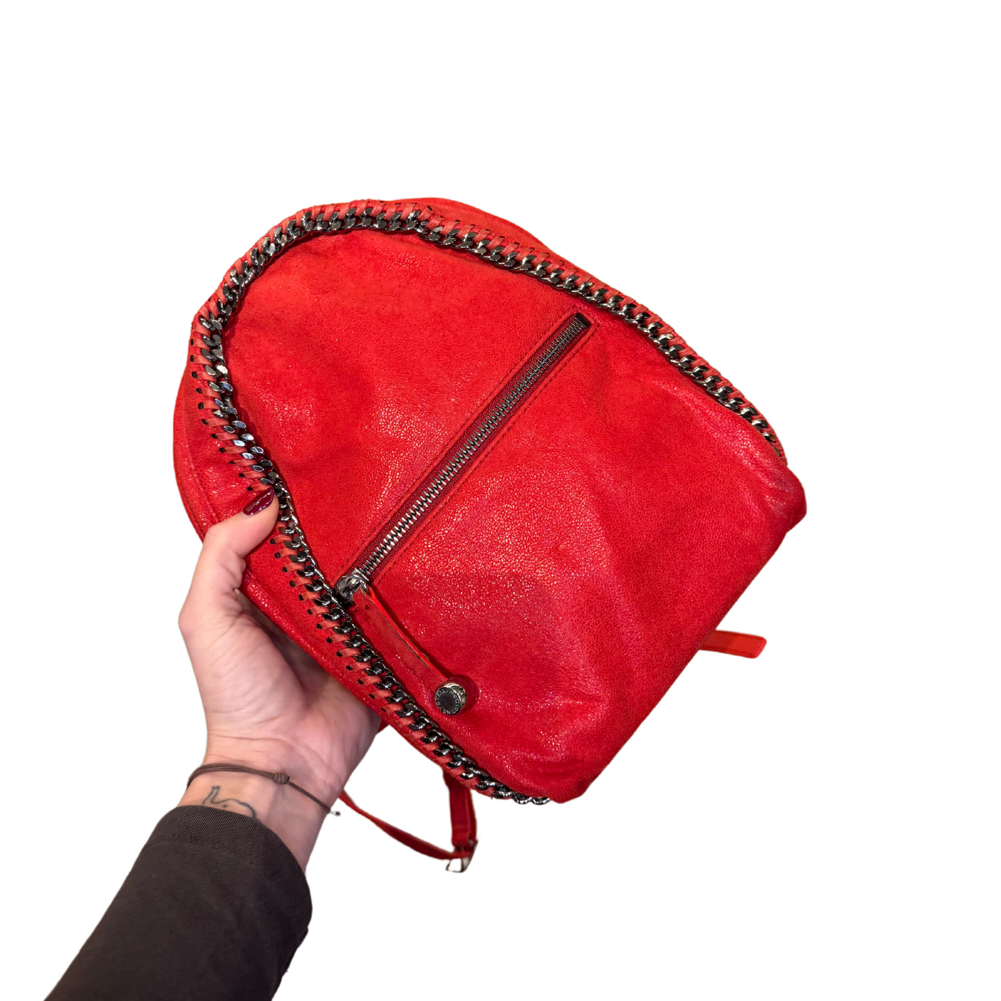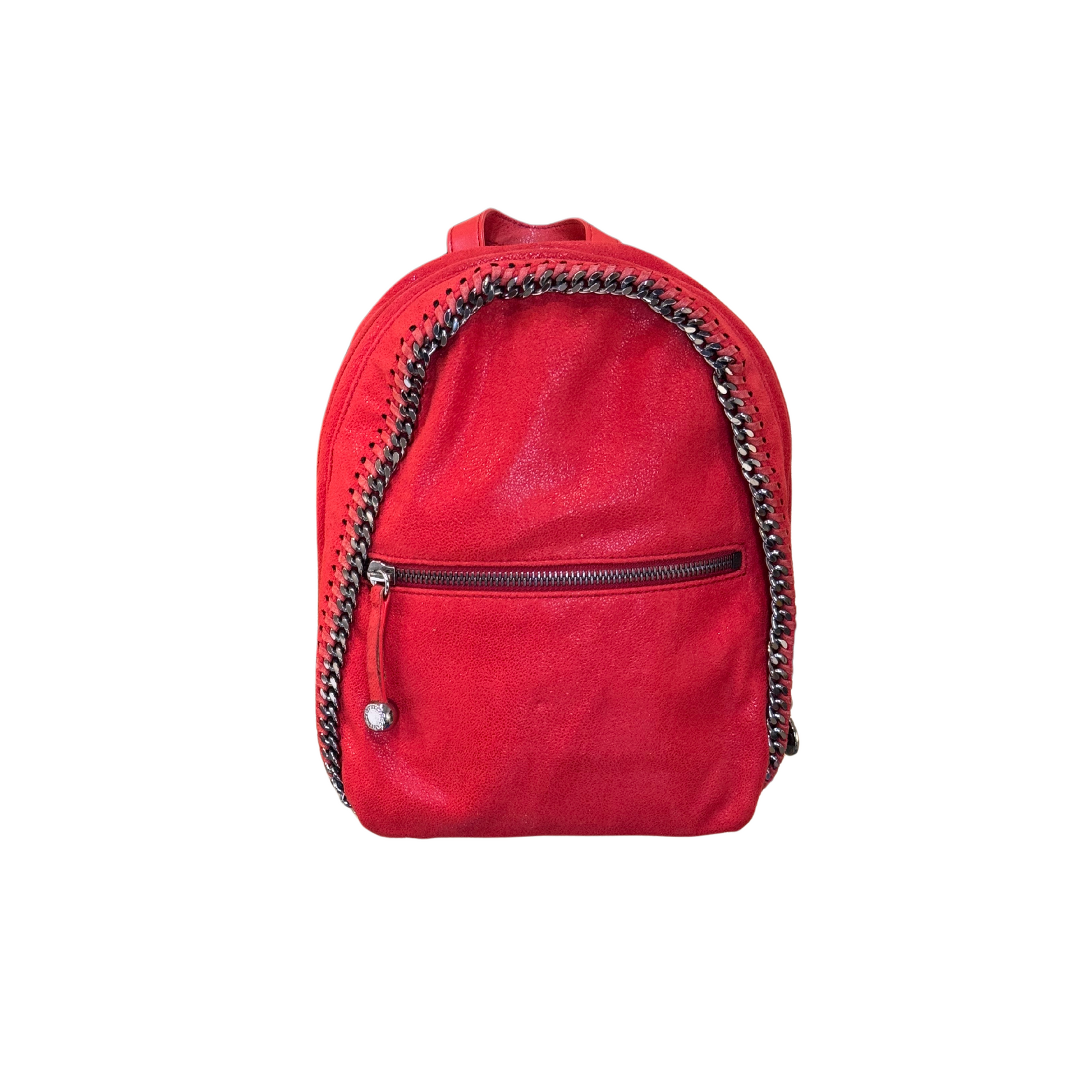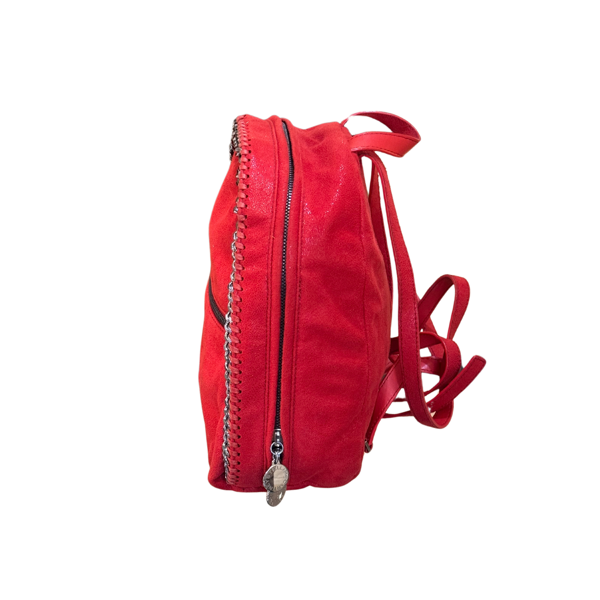 Zainetto Stella Mccartney realizzato in alter suede rosso, impreziosito da iconica catena in metallo argentato. Tasca esterna frontale con cerniera. Bretelle in ecopelle rossa regolabili. Interno in tessuto logato rosa antico.