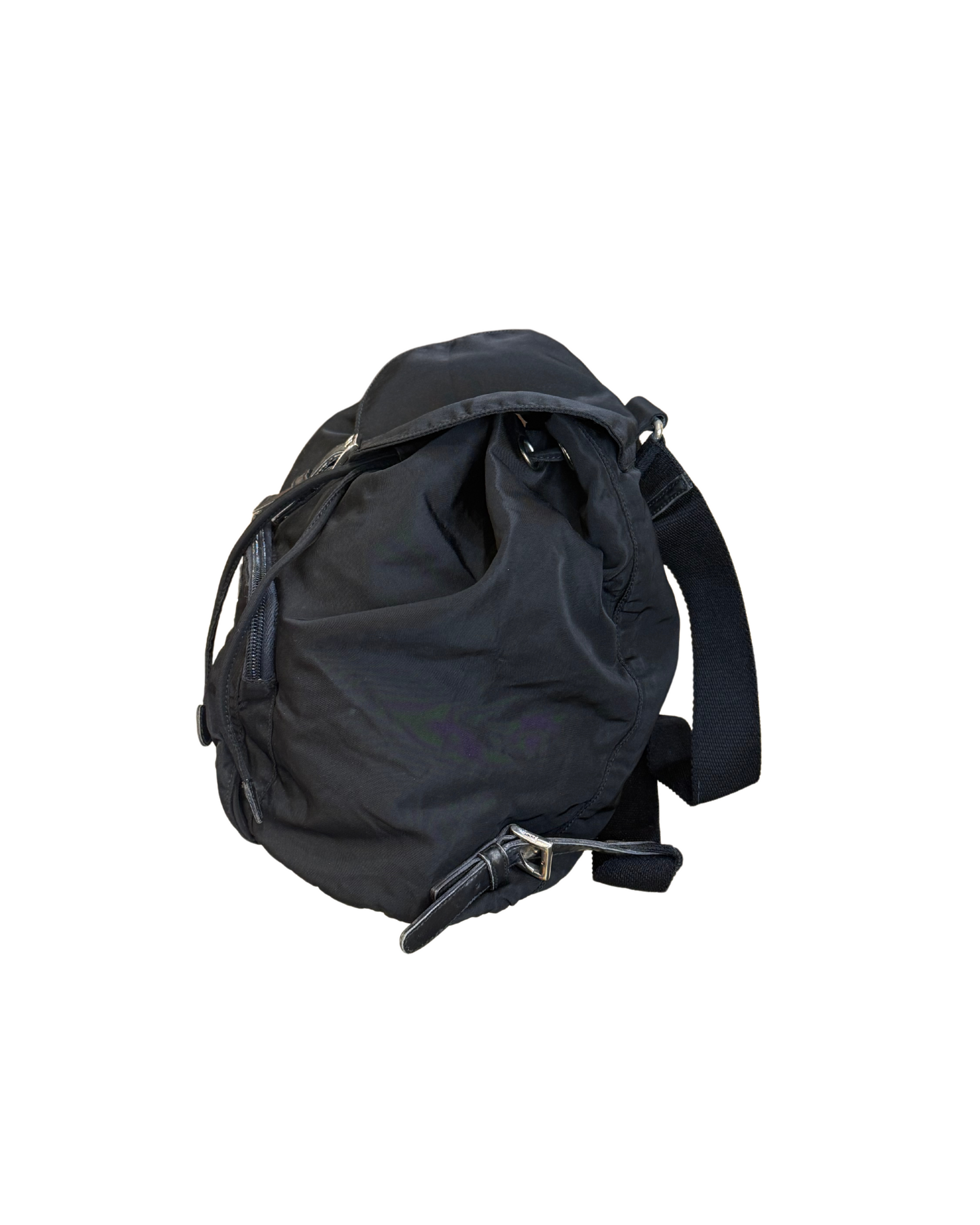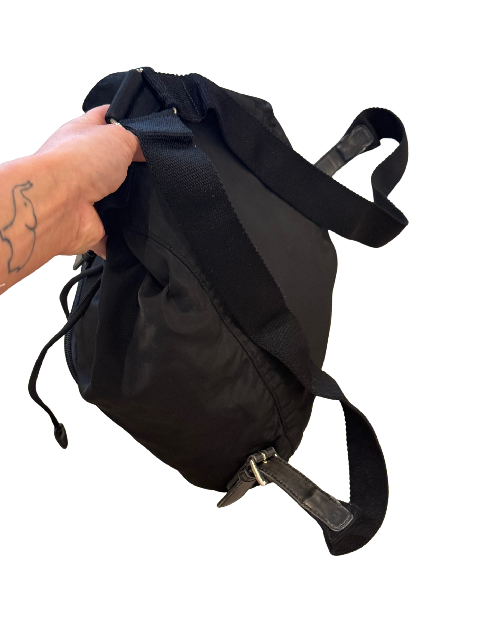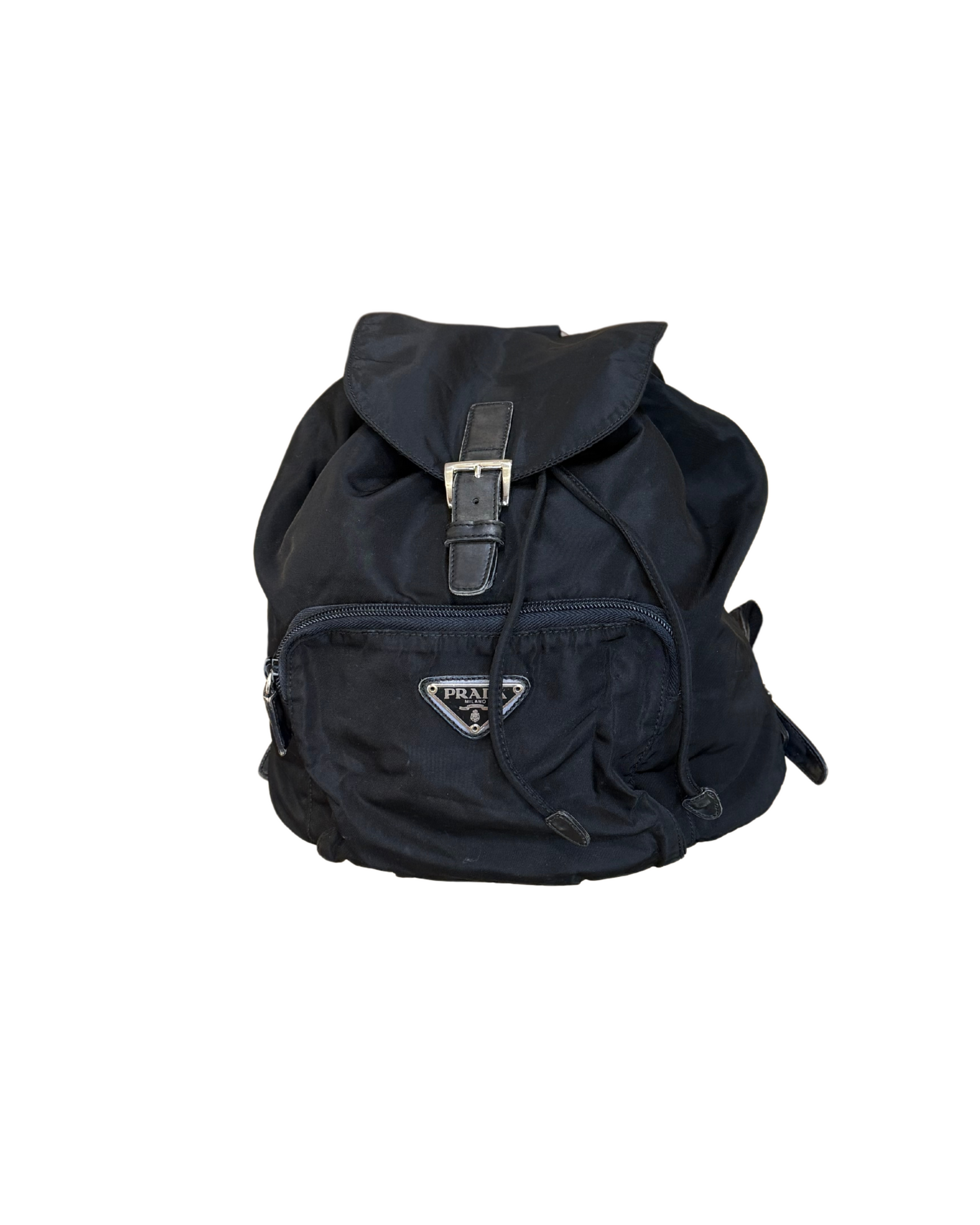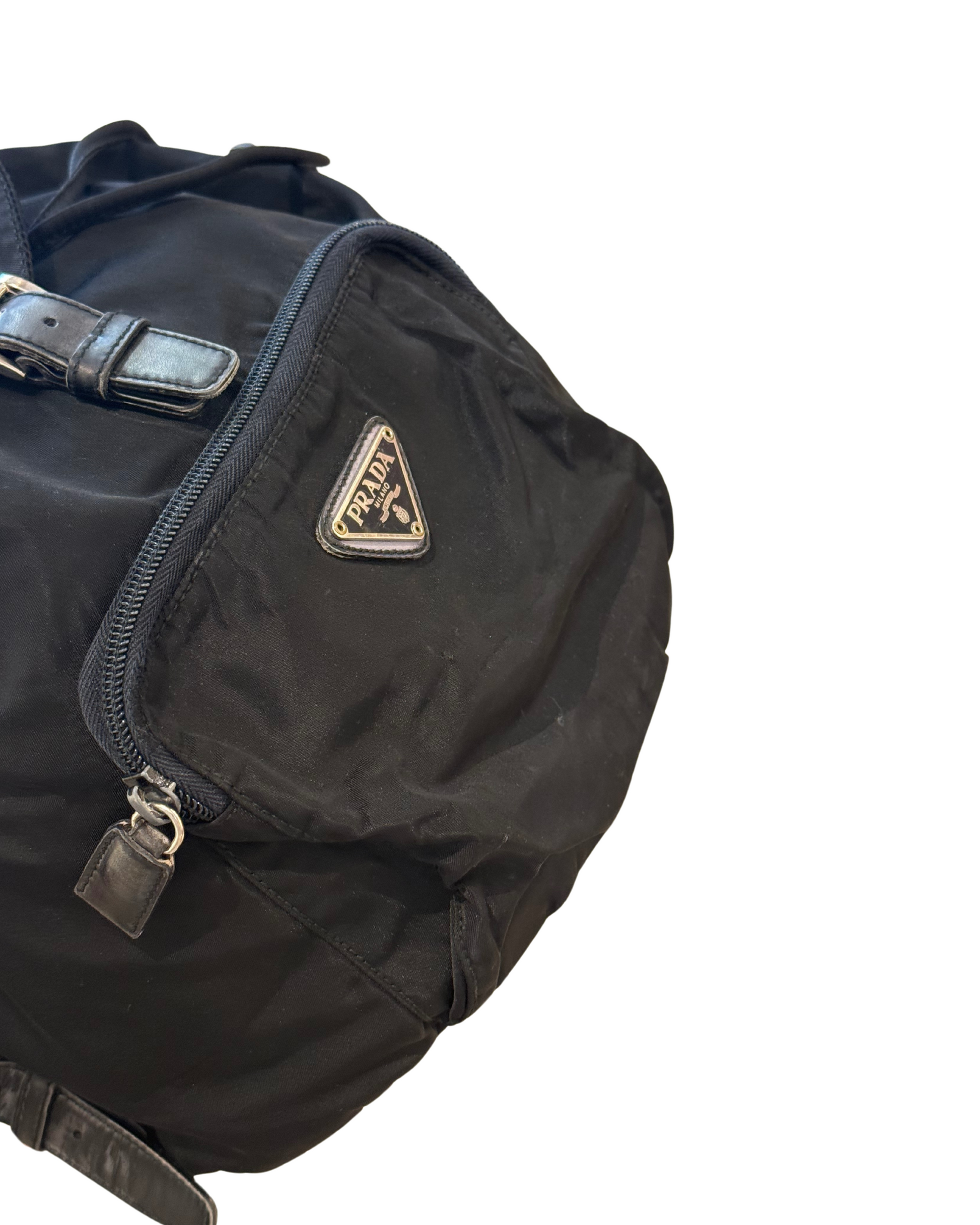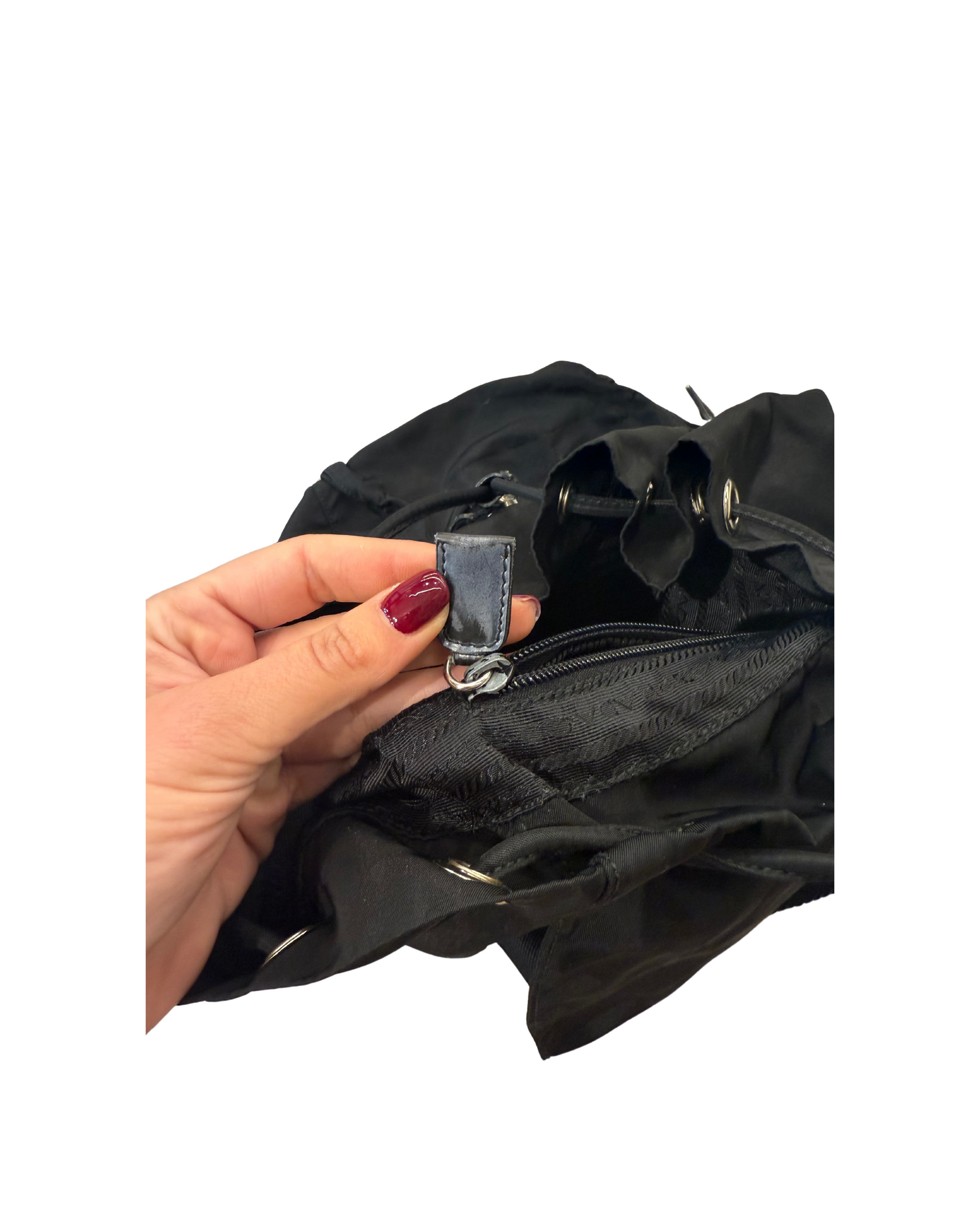 Zaino di prada in nylon nero con dettagli in pelle, uno dei modelli più iconici del brand, apprezzato per la sua praticità e stile senza tempo. Finiture in metallo argentato, con fibbie regolabili sulle bretelle e chiusura frontale con fibbia. Chiusura con coulisse interna più patta con fibbia. Logo lettering frontale. Interno foderato con tessuto logato Prada , con zip interna. Bretelle in tessuto tecnico con base in pelle . Una tasca esterna con zip sulla parte frontale.