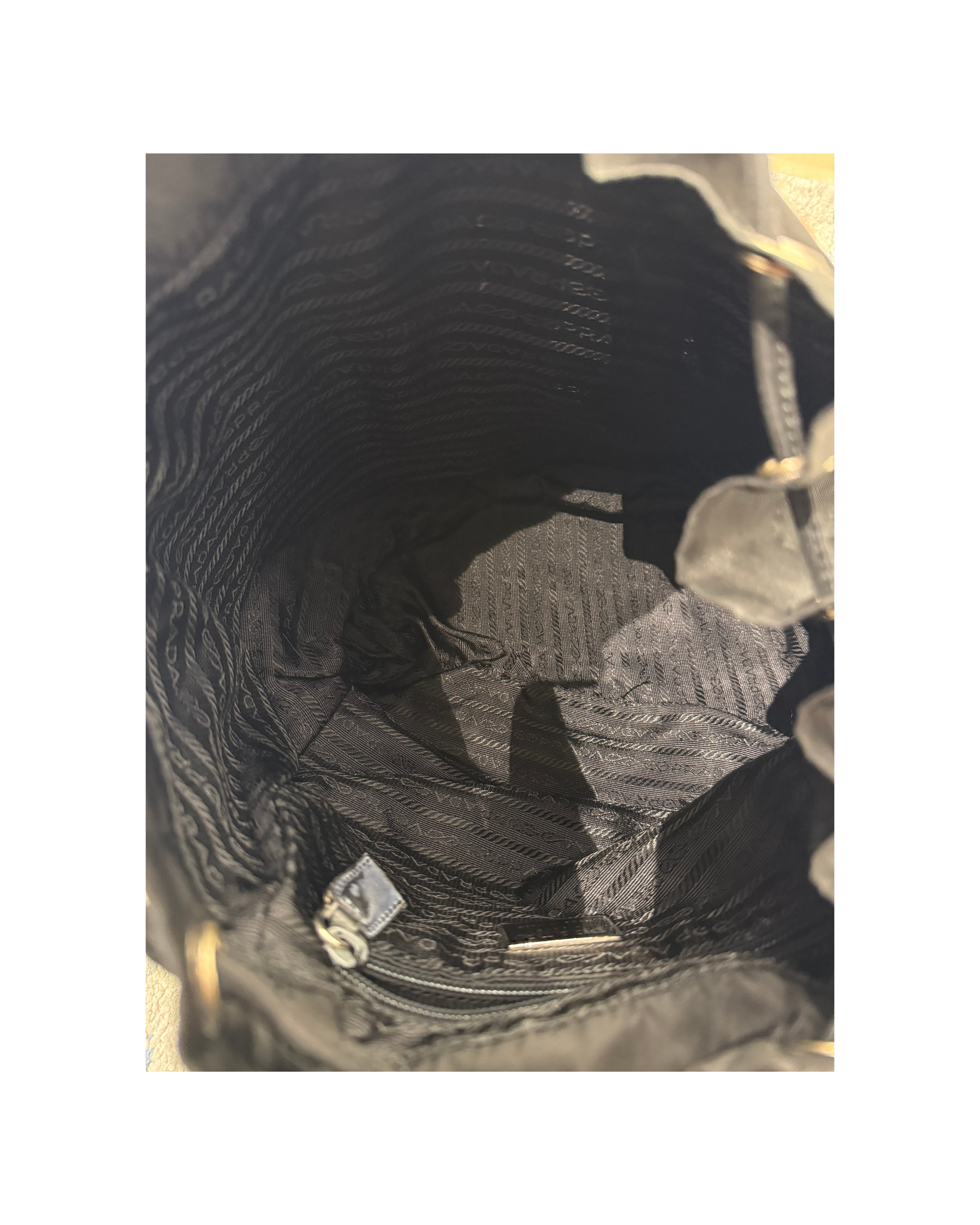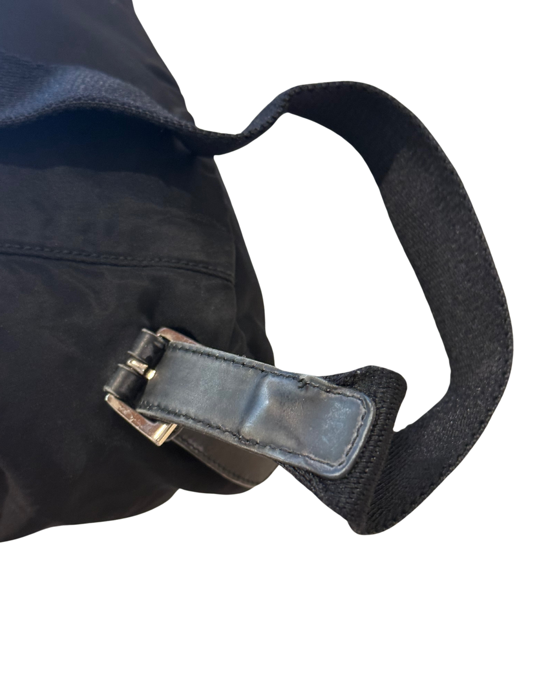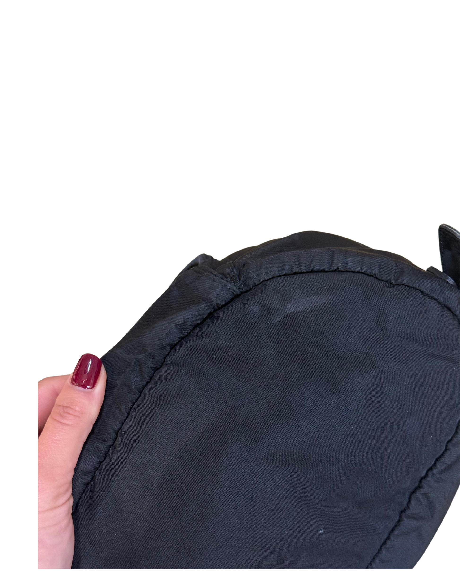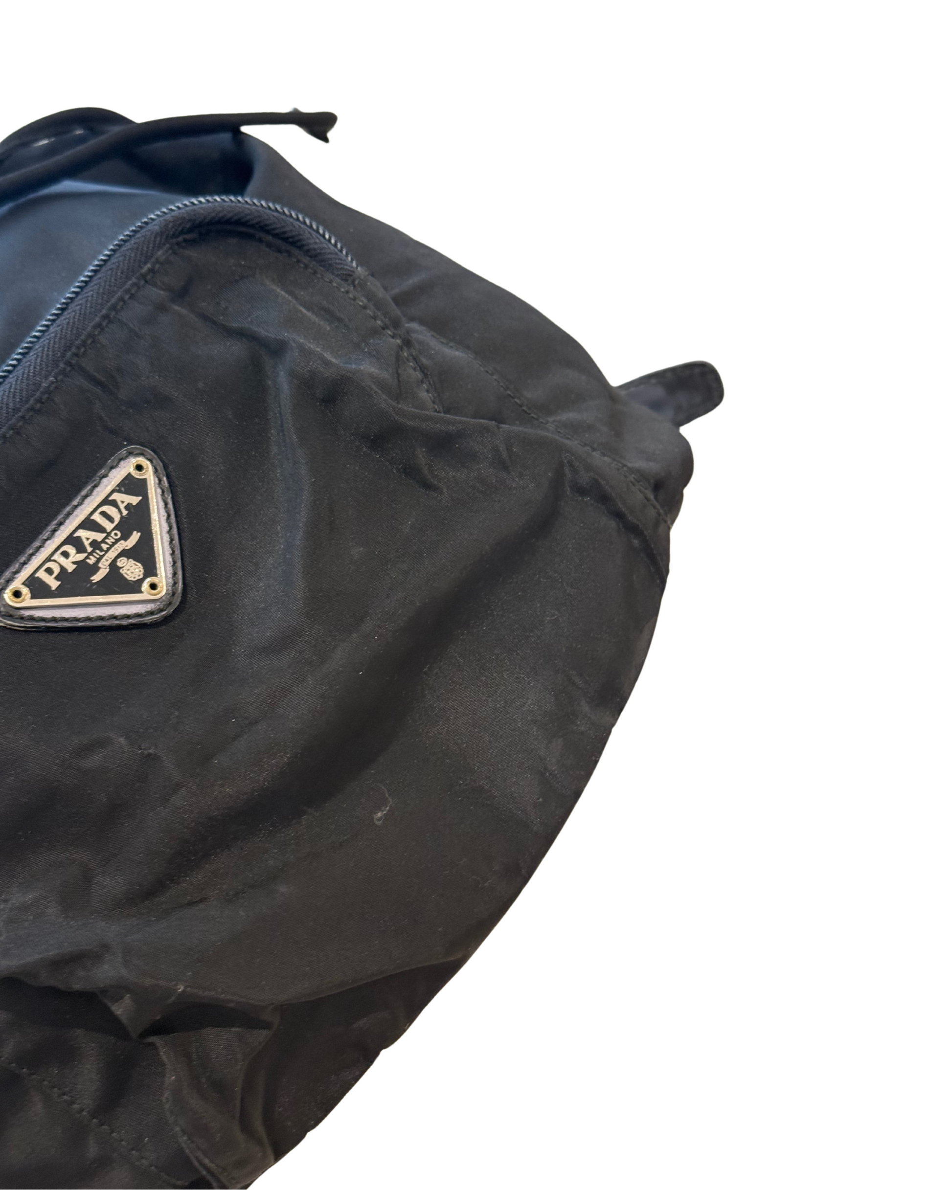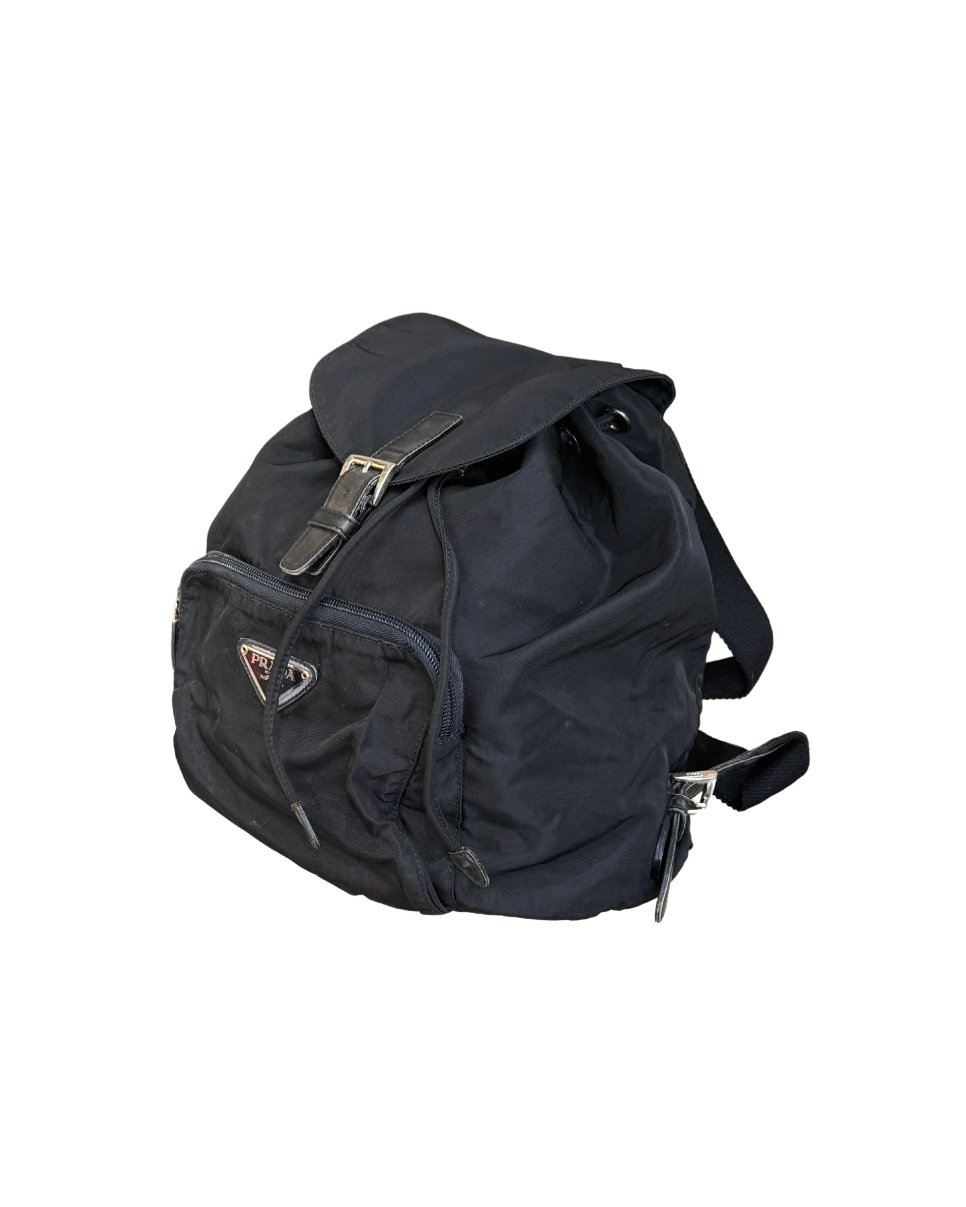 Zaino di prada in nylon nero con dettagli in pelle, uno dei modelli più iconici del brand, apprezzato per la sua praticità e stile senza tempo. Finiture in metallo argentato, con fibbie regolabili sulle bretelle e chiusura frontale con fibbia. Chiusura con coulisse interna più patta con fibbia. Logo lettering frontale. Interno foderato con tessuto logato Prada , con zip interna. Bretelle in tessuto tecnico con base in pelle . Una tasca esterna con zip sulla parte frontale.